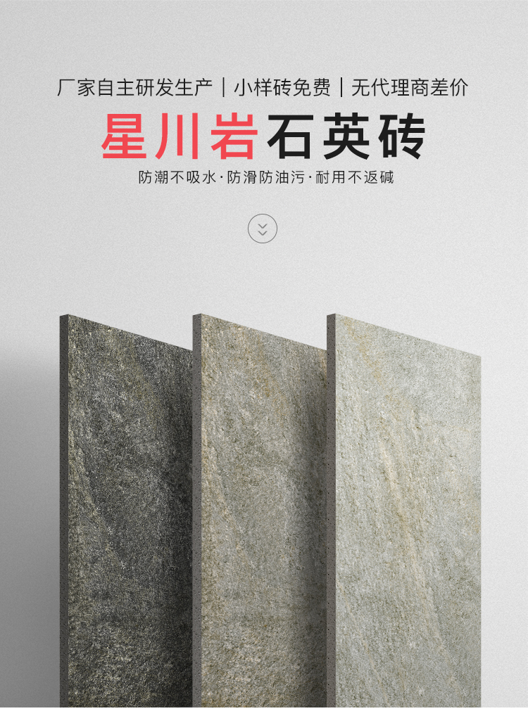 復刻板巖的自然層理紋路,觸感是細密的磨砂質(zhì)感,既保留石材的原生觸感,又因石英磚材質(zhì)更順滑耐用