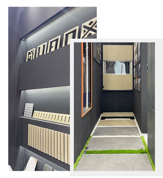 展廳地面不僅呈現(xiàn)了生態(tài)石英磚的鋪貼方式,還讓產(chǎn)品肌理與植物、與鵝卵石還原了真實(shí)的花園庭院環(huán)境,讓大家能身臨其境,打破固有束縛,塑造富有自然氣息的生態(tài)感,實(shí)現(xiàn)了人與空間的多維互動(dòng)。展館空間的整體美感離不開每一處構(gòu)造與產(chǎn)品的完美結(jié)合,靈動(dòng)唯美的最全花色樣磚如畫作般展示于墻上,從正面到側(cè)面到背面,讓現(xiàn)場(chǎng)參觀者全方位了解“30mm厚磚新時(shí)代”。