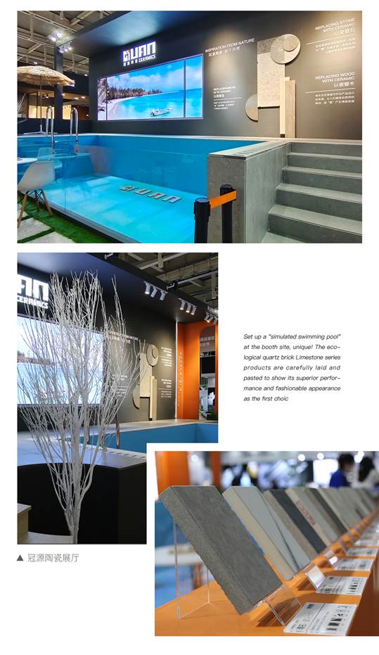 會(huì)上,冠源陶瓷以“模擬泳池”實(shí)景陳列主題館震撼登場,通過產(chǎn)品矩陣、動(dòng)感設(shè)計(jì)帶領(lǐng)觀眾共啟全新境界,以小見大、以載體展整體,向全行業(yè)及全球客戶展示冠源制造“真材實(shí)料”的創(chuàng)新工藝和“極致品質(zhì)”的非凡實(shí)力。