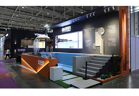 展位現(xiàn)場搭建“模擬泳池”,別出心裁!以生態(tài)石英磚萊姆石系列產(chǎn)品精心鋪貼,展現(xiàn)其身為戶外用磚首選的優(yōu)越性能、時(shí)尚外觀,展現(xiàn)其靈活運(yùn)用于酒店空間建設(shè)中的畫龍點(diǎn)睛之效!